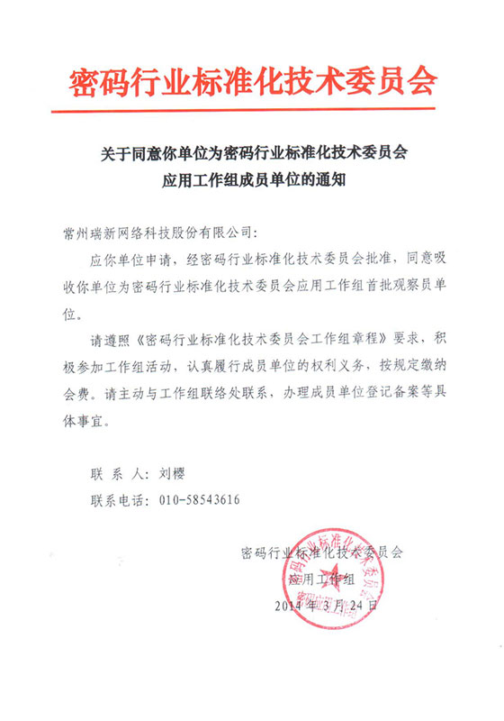 應(yīng)我單位申請(qǐng),經(jīng)密碼行業(yè)標(biāo)準(zhǔn)化技術(shù)委員會(huì)批準(zhǔn),我單位被吸收為密碼行業(yè)標(biāo)準(zhǔn)化技術(shù)委員會(huì)應(yīng)用工作組首批觀察員單位。