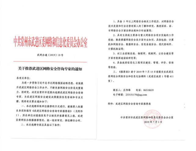 2019年7月1日,為進(jìn)一步貫徹習(xí)近平總書記網(wǎng)絡(luò)強(qiáng)國(guó)的戰(zhàn)略思想,有效提升武進(jìn)區(qū)網(wǎng)絡(luò)安全水平,不斷完善網(wǎng)絡(luò)安全防范處置能力,中共常州市武進(jìn)區(qū)委網(wǎng)絡(luò)和信息化委員辦公室發(fā)布《關(guān)于推薦武進(jìn)區(qū)網(wǎng)絡(luò)安全咨詢專家的通知》。