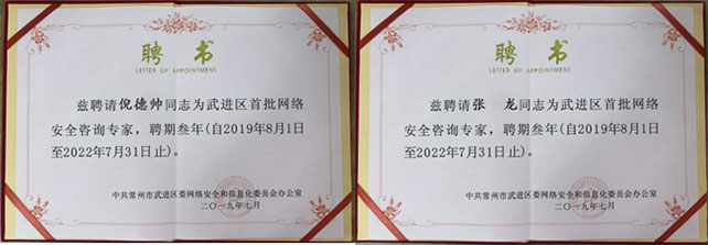 我公司倪德帥、張龍同志被聘為武進(jìn)區(qū)首批網(wǎng)絡(luò)安全咨詢專家。今后,將在中共常州市武進(jìn)區(qū)委網(wǎng)絡(luò)和信息化委員會(huì)辦公室的領(lǐng)導(dǎo)下發(fā)展自身的專業(yè)特長(zhǎng),有序的開展網(wǎng)絡(luò)安全相關(guān)工作,為武進(jìn)區(qū)網(wǎng)絡(luò)安全建設(shè)決策提供信息咨詢和專業(yè)支撐。