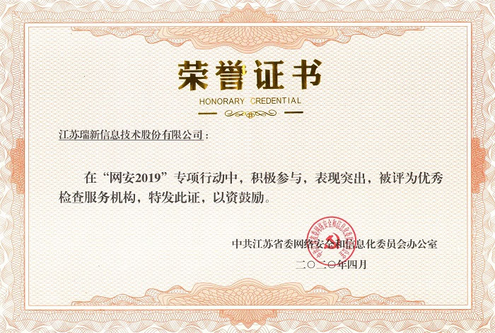 2020年4月17日在江蘇省網(wǎng)絡(luò)安全工作推進(jìn)會(huì)議上,瑞新股份憑借著在“網(wǎng)安2019”專項(xiàng)行動(dòng)中的各項(xiàng)網(wǎng)絡(luò)安全專項(xiàng)檢查及保障工作中的卓越表現(xiàn),被評(píng)為“‘網(wǎng)安2019’專項(xiàng)行動(dòng)優(yōu)秀檢查服務(wù)機(jī)構(gòu)”。