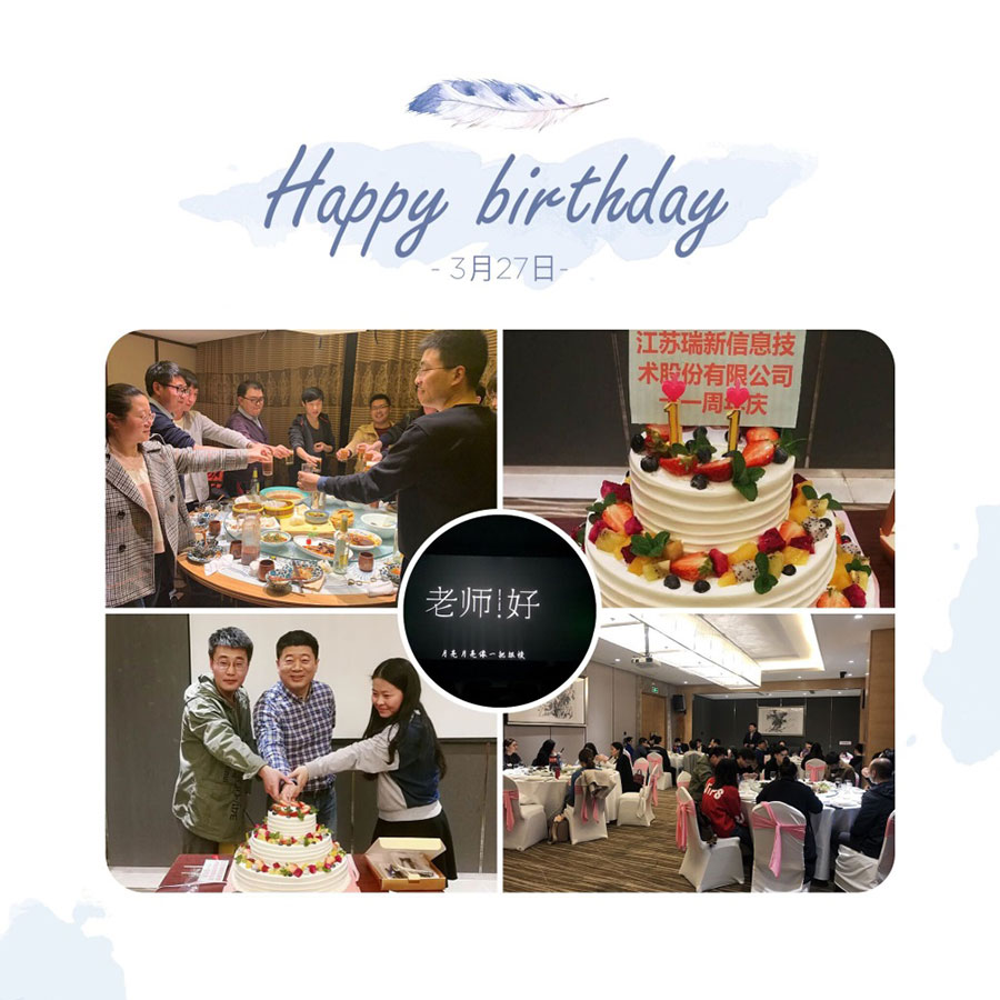 2019年3月27日,迎來了瑞新股份第11個(gè)生日。為了慶祝這一特殊的日子,下午2點(diǎn)30分,常州總部員工在常州大劇院觀看電影《老師好》,致敬人生中遇到的每一位優(yōu)秀的老師。晚上全體員工分別在常州華美達(dá)大酒店和南京川越酒店參加聚餐,慶祝公司生辰,同時(shí)為3月份生日的員工一起慶祝生日。