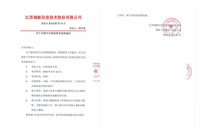 為了提高涉密人員的保密意識,增強保密工作能力。2019年7月11日,公司發(fā)布《關(guān)于開展半年度保密考試的通知》。