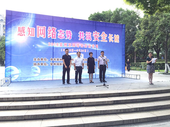 正值“九·一八事變”85周年之際,以“感知網(wǎng)絡(luò)態(tài)勢,共筑安全長城”為主題的“2016常州市網(wǎng)絡(luò)安全宣傳周”啟動儀式于市中心人民公園舉行。常州市委外宣辦主任、市政府新聞辦主任、市委宣傳部副部長孫潔茹,常州市經(jīng)濟(jì)和信息化委員會副主任楊軍,常州市委與常州瑞新網(wǎng)絡(luò)科技股份有限公司各位領(lǐng)導(dǎo)出席了啟動儀式。
