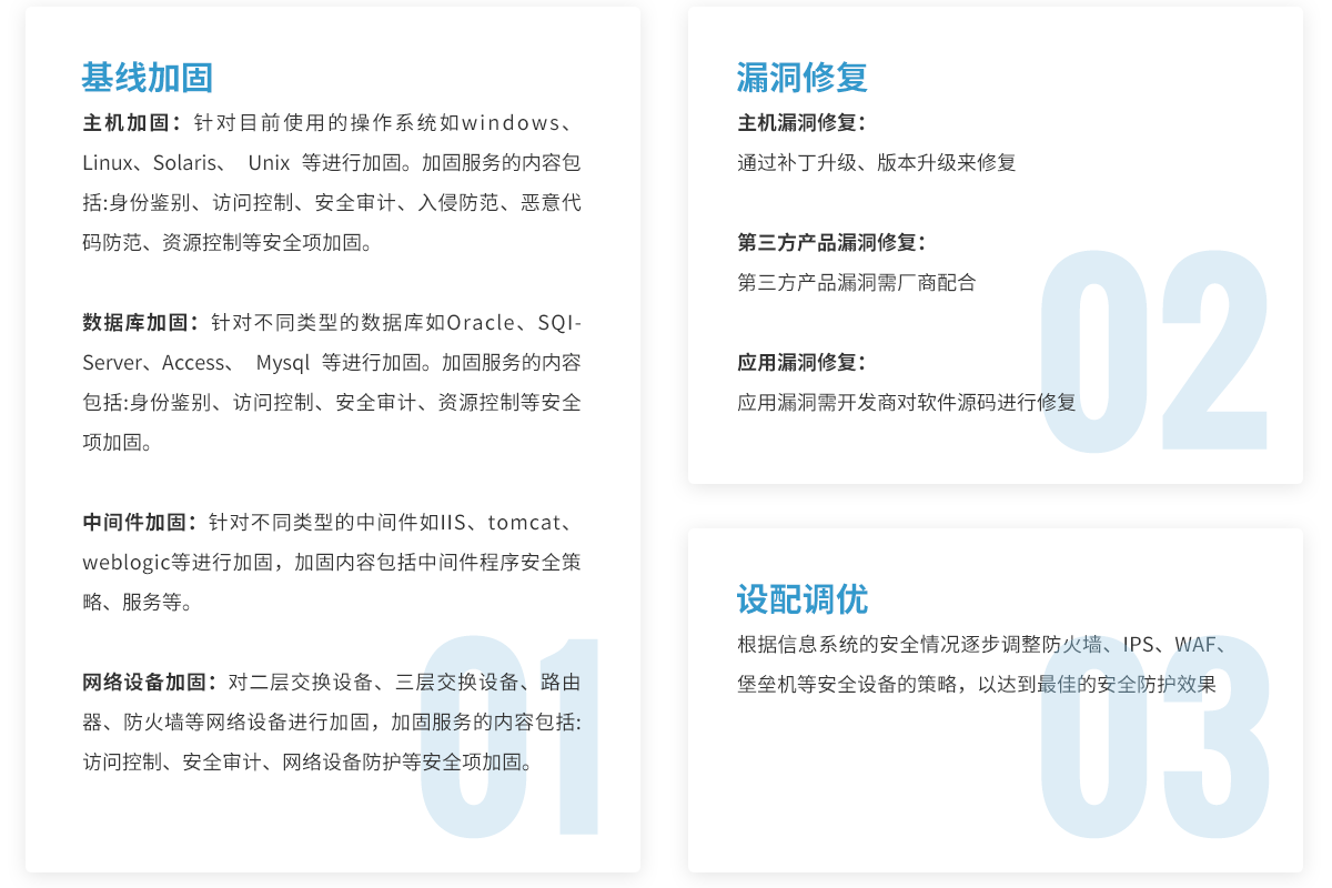 安全加固是指參考國內(nèi)國際權(quán)威的系統(tǒng)安全配置標(biāo)準(zhǔn),并結(jié)合用戶信息系統(tǒng)實際情況,在用戶允許的前提下,對信息系統(tǒng)涉及的主機(jī)、網(wǎng)絡(luò)設(shè)備、應(yīng)用及數(shù)據(jù)庫進(jìn)行安全配置加固、漏洞修復(fù)和安全設(shè)備調(diào)優(yōu)。