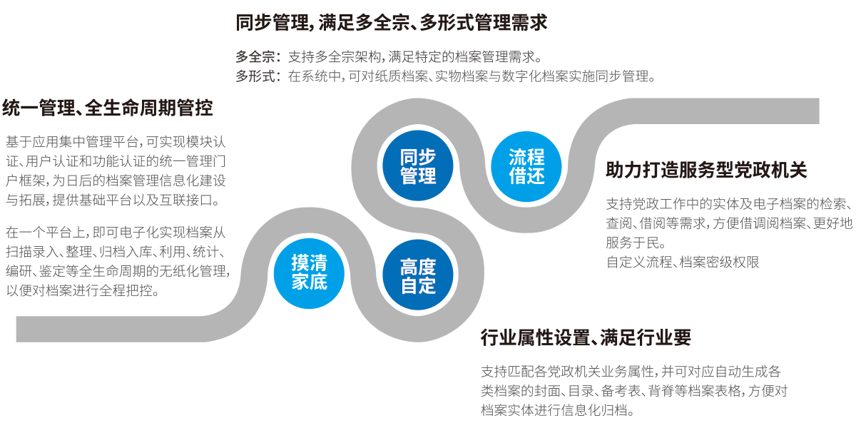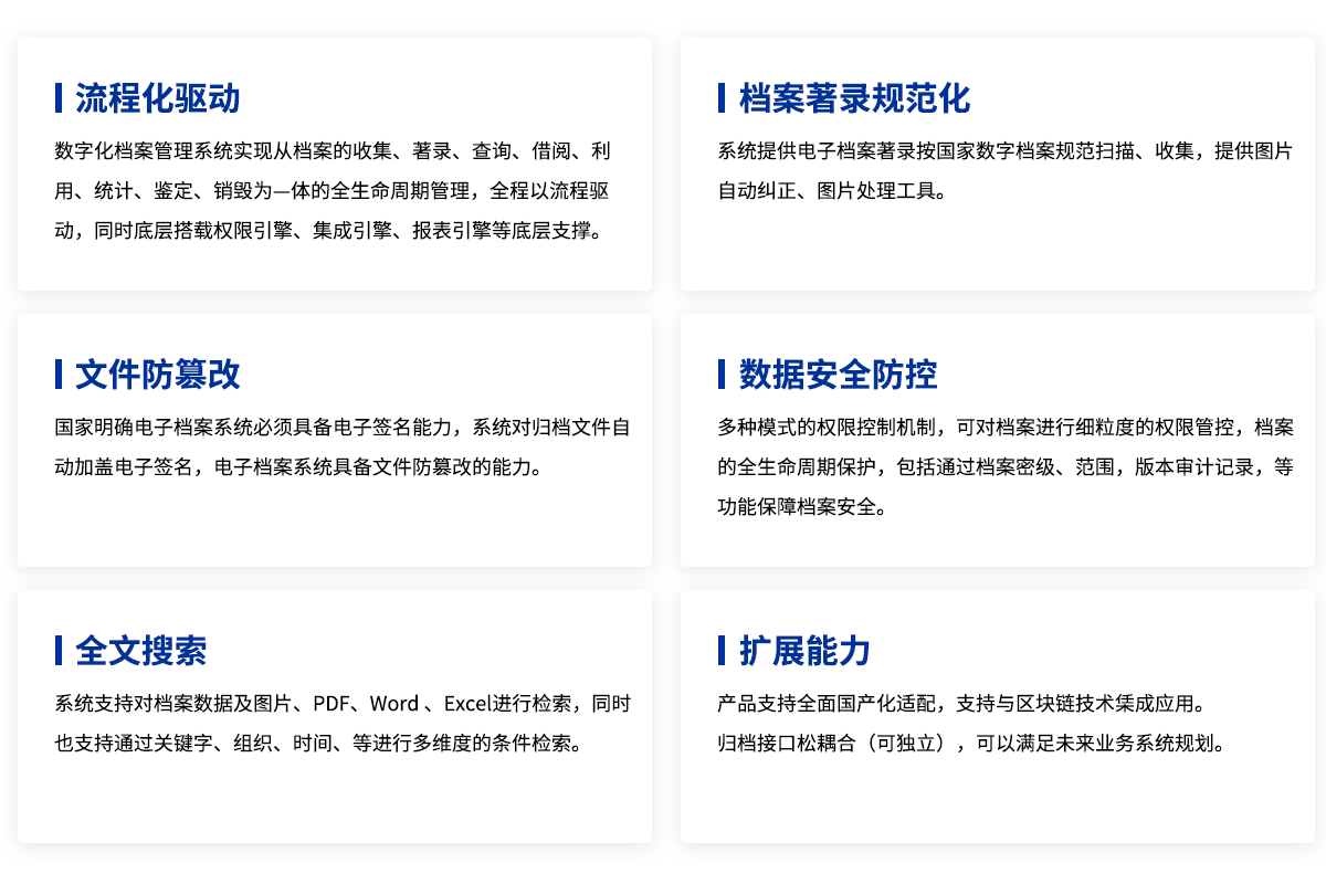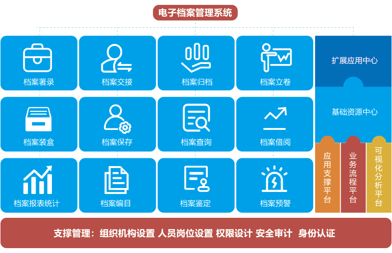 智慧檔案管理系統(tǒng)實(shí)現(xiàn)文書、科技、人事、會(huì)計(jì)、音像、專業(yè)、實(shí)物等檔案管理,涵蓋形成與收集、整理與歸檔、保管與保護(hù)、鑒定與銷毀、利用與開(kāi)發(fā)、統(tǒng)計(jì)與移交全過(guò)程規(guī)范化管理,提供檔案管理與服務(wù),滿足檔案者和利用者實(shí)際使用需求,全面提升檔案管理的規(guī)范性、高效性、智能性、便利性、安全性。