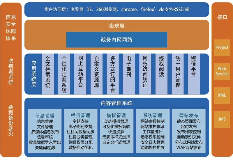 門戶網站群平臺采用統(tǒng)一平臺、內容共建共享的方式構建,為黨政機關用戶提供安全的內容管理與按權限瀏覽、檢索服務等,以支撐實現各地黨政機關“跨層級、跨地域、跨部門”安全有效的利用和共享內網資源的需要,統(tǒng)一展示各級黨政領導決策、部門業(yè)務管理、機關內部運轉等工作,提供黨政業(yè)務信息資源的發(fā)布、檢索服務,消除“信息孤島”、“應用孤島”。