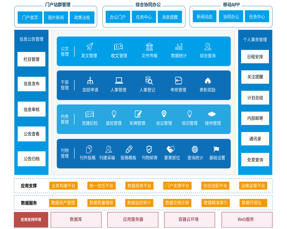 瑞新綜合業(yè)務(wù)辦公平臺是面向黨政行業(yè)條線,實現(xiàn)內(nèi)部協(xié)助,高效辦公的協(xié)同辦公—體化平臺,包括公文管理、干部管理、內(nèi)務(wù)管理、刊物管理、信息公告管理和個人事務(wù)管理等功能。系統(tǒng)設(shè)計有靈活的擴(kuò)展能力,既適應(yīng)目前辦公業(yè)務(wù)的需要,又適應(yīng)未來業(yè)務(wù)流程、業(yè)務(wù)內(nèi)容隨政策調(diào)整的需要,系統(tǒng)設(shè)計采用層次化、模塊化、組件化、面向?qū)ο蟮捏w系架構(gòu)。